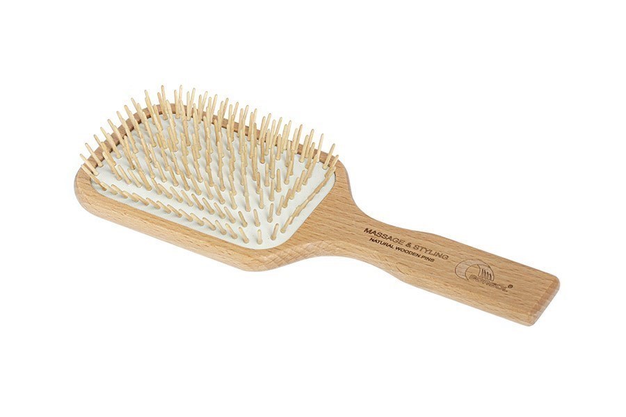 Kvalitná široká drevená kefa vhodná pre dlhé vlasy. Drevené ostne zapustené do pneumatického gumeného podkladu zabezpečujú lepšie "pruženie" štetín a pohodlnejšie česanie hustých a dlhých vlasov.