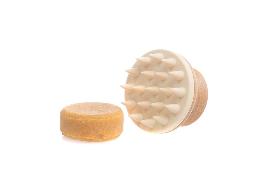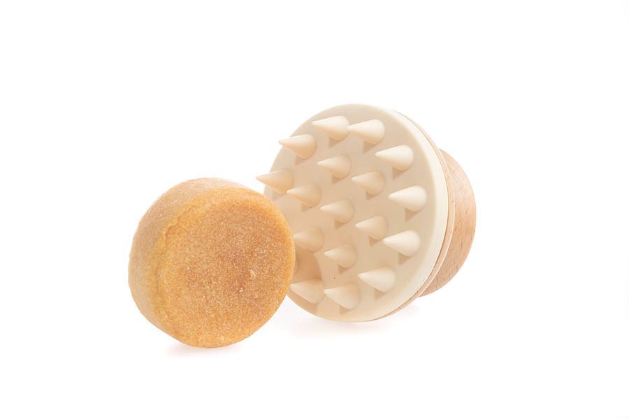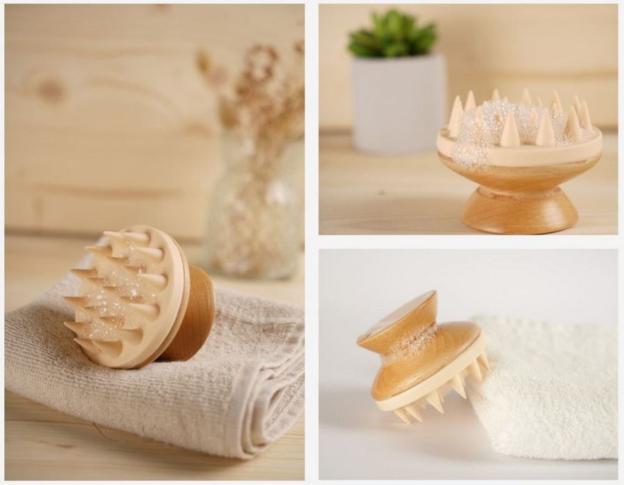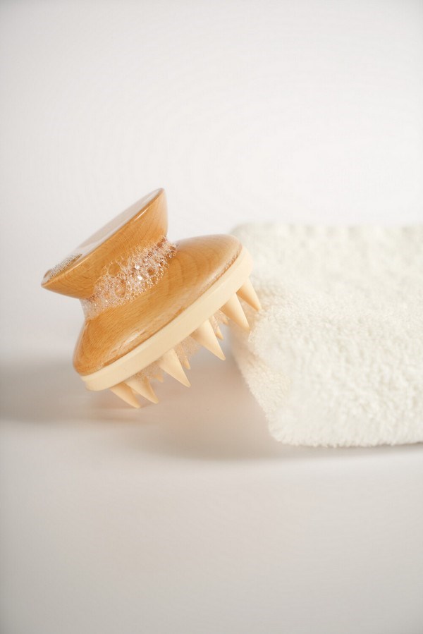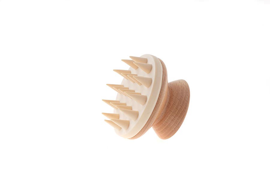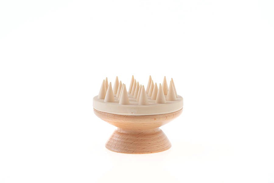 Drevená kefa so silikónovými štetinami na masáž hlavy - či už v sprche na nanášanie šampónu alebo na suchú masáž.