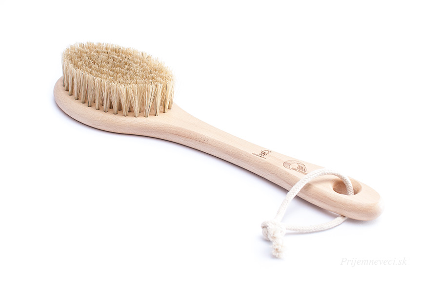 Drevená masážna kefa do sauny i do sprchy. Prírodné prasacie štetiny sú výrazne jemnejšie ako vlákna tampica. Po namočení ešte mierne zmäknú.