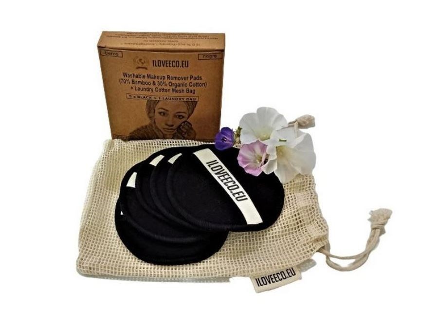 Veľké odličovacie tampóny v biokvalite. Ušité z bavlny s cerfifikátom GOTS. V balení nájdete 5 čiernych odličovacích tampónov a sieťové vrecko na pranie a skladovanie tampónov.