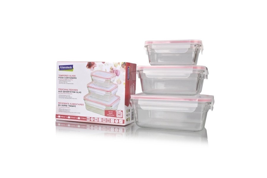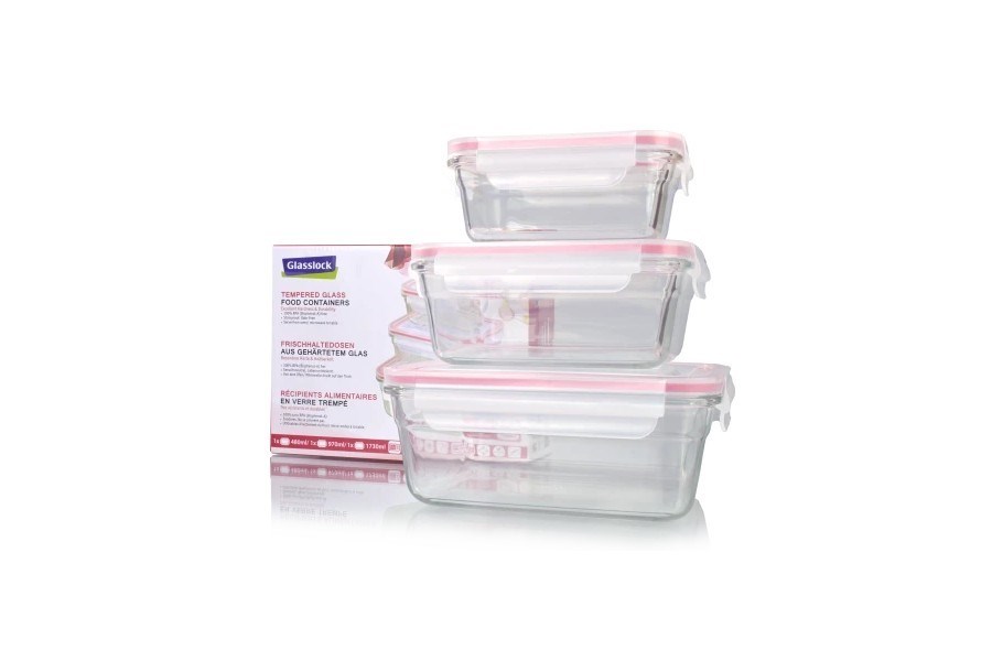 Vzduchotesné, vodotesné, zdravotne nezávadné dózy z tvrdeného skla od značky Glasslock. Sklenené nádoby sú vhodné na prenos či skladovanie jedla, ale aj na pečenie a zapekanie pokrmov v rúre. Objem nádob je 480ml, 970ml a 1730ml.