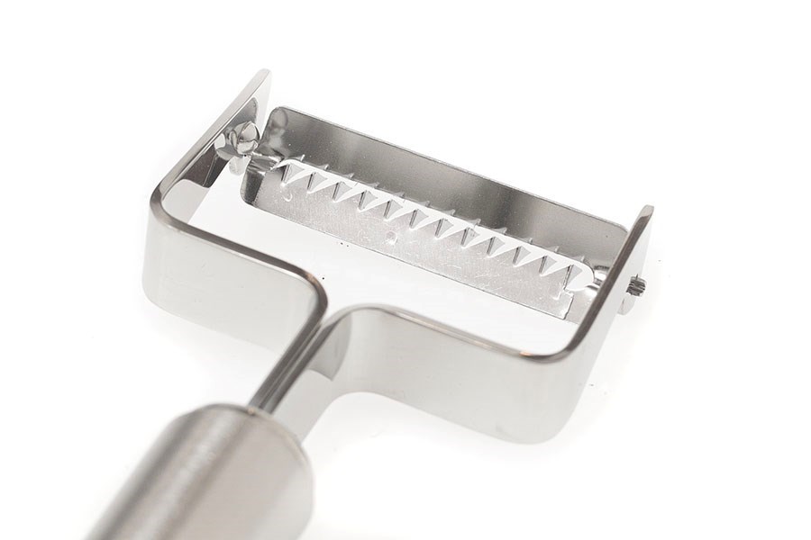 Nerezová škrabka na zeleninu s ostrou a pohyblivou čepeľou - má viac malých paralelných čepelí, vďaka ktorým vznikajú tenké prúžky zeleniny.