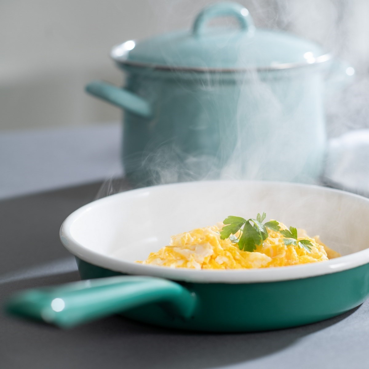 Pri smažení vajec na smaltovanej panvici potrebujete maslo alebo olej, ale nie pri príliš vysokej teplote. Najlepším testom je pridať na panvicu kvapku vaječnej zmesi. Ak sa kvapka okamžite zmenší, panvica je príliš horúca; ak sa nič nestane, je príliš studená. Hneď ako sa kvapka mierne zrazí, panvica dosiahla optimálnu teplotu. Teraz nalejte celú zmes, mierne znížte teplotu, pretože smalt udržiava teplo, a počkajte, kým sa omeleta ľahko oddelí od dna panvice. Až potom omeletu otočte.