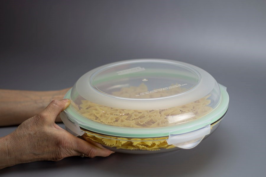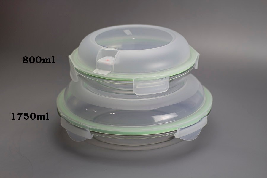Vzduchotesný, vodotesný, zdravotne nezávadný tanier s vrchnákom. Z pevného tvrdeného skla - od značky Glasslock.